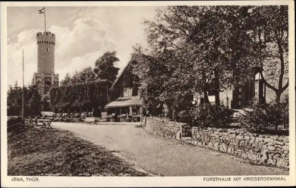 Ak Jena in Thüringen, Forsthaus mit Kriegerdenkmal