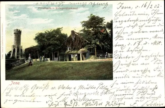 Ak Jena in Thüringen, Forsthaus und Kriegerdenkmal, Turm