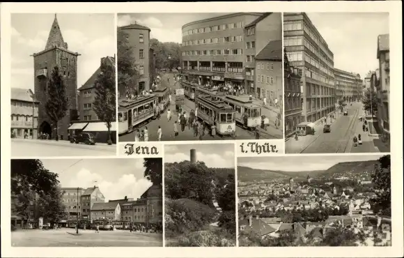 Ak Jena in Thüringen, Kirchturm, Straßenbahn, Straßenpartie