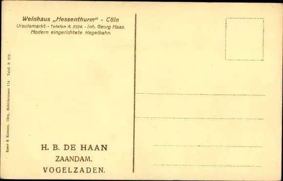 Zustand, siehe Scan, ungelaufen- Fehldruck Rückseite Köln am Rhein, Weinhaus Hessenthurm, Ursulamarkt, Inh. Georg Haas - ca 14 cm X 9 cm