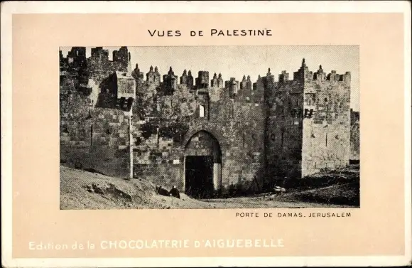 Ak Jerusalem Israel, Blick aufs Damaskus Tor, Reklame, Chocolaterie d'Aiguebelle