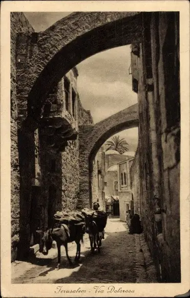Ak Jerusalem Israel, Via Dolorosa, Gasse, Mann mit Eseln
