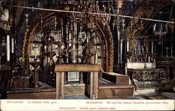 Ak Jerusalem Israel, XII. u. XIII. Station Golgatha, griechischer Altar