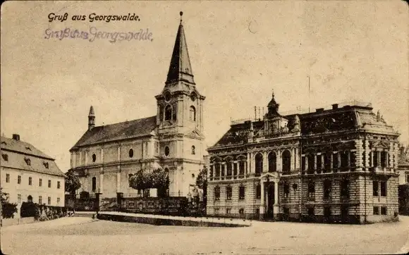 Ansichtskarte, Postkarte, Aussig, Ústí nad Labem, Jiříkov, Georgswalde, Kirche