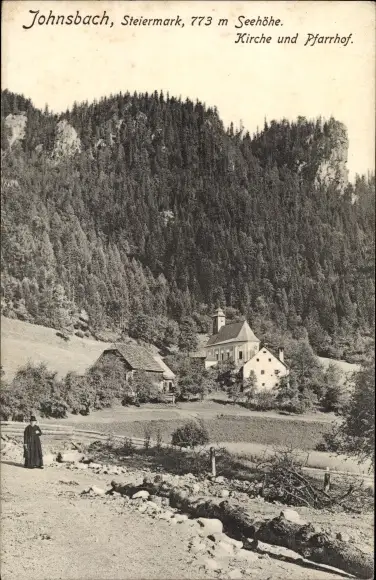 Ak Johnsbach Steiermark, Kirche und Pfarrhof