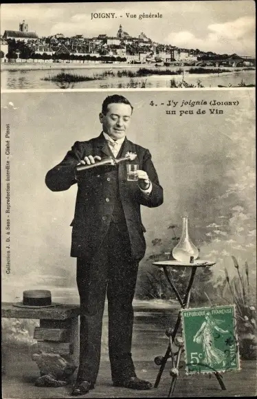 Ak Joigny Yonne, Vue generale, J'y joignis un peu de Vin, Mann mit Weinflasche