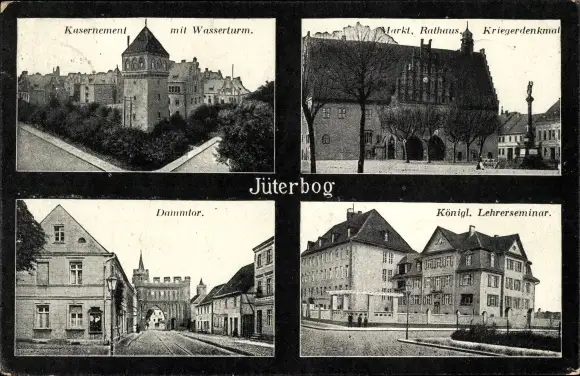 Ak Jüterbog in Brandenburg, Kasernement , Wasserturm, Markt, Rathaus, Kriegerdenkmal, Dammtor