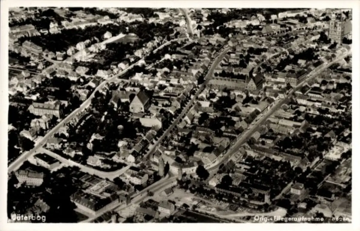 Ak Jüterbog in Brandenburg, Luftaufnahme von Wohngebäude, Straßen, Landschaft