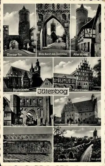 Ak Jüterbog in Brandenburg, Rathaus, Zinnaer Tor, Dammtor, Nokolaikirche, Marienkloster, Stadtmauer