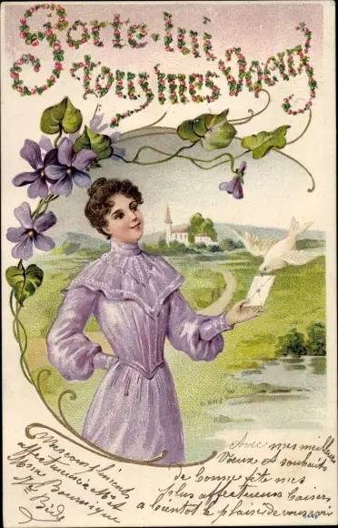 Ak Junge Frau, Taube mit Brief im Schnabel, Blumen