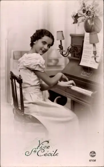 Ak Junge Frau am Klavier, Noten, Blumen