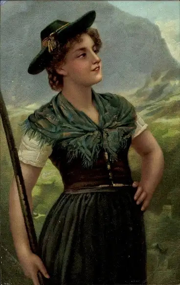 Ak Junge Frau in Tracht, Gehstock, Hut