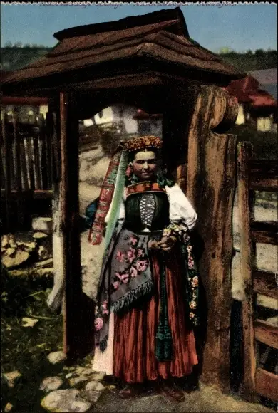 Ak Junge Frau in ungarischer Tracht, Wohnhaus