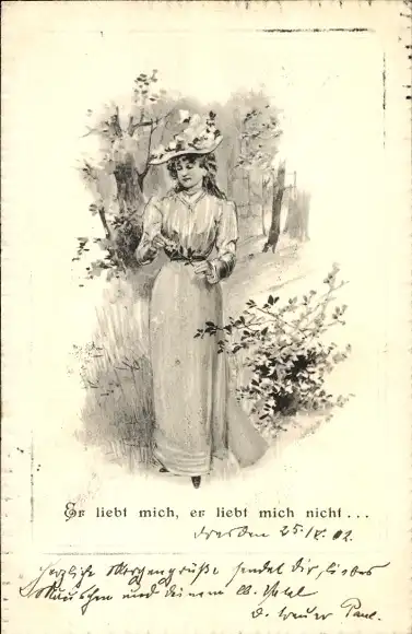 Ak Junge Frau mit Blumen, Liebe, Er liebt mich, er liebt mich nicht