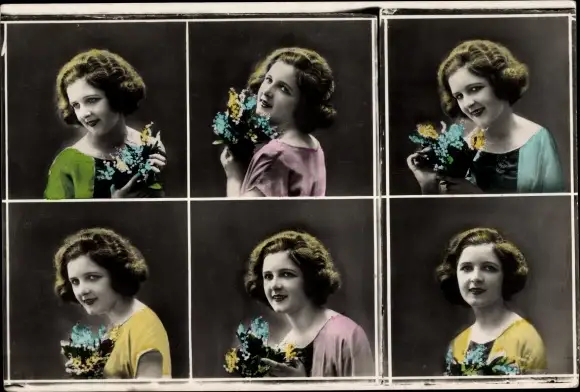 Ak Junge Frau mit Blumenstrauß, colorierte Portraits
