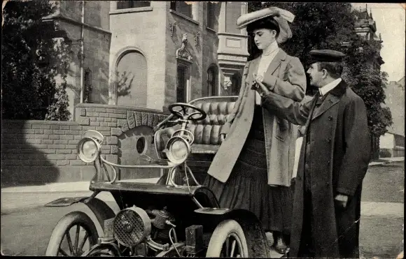 Ak Junge Frau steigt in Automobil