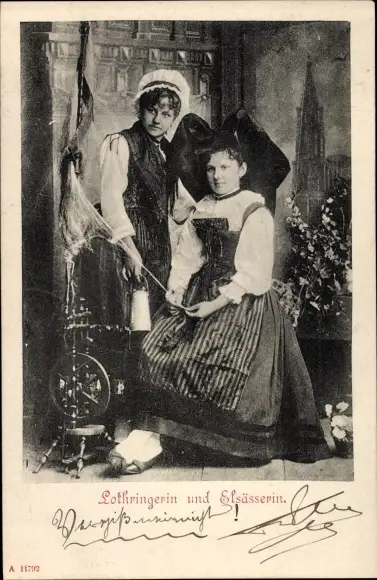 Ak Junge Frauen in Tracht, Elsässerin, Lothringerin, Spinnrad