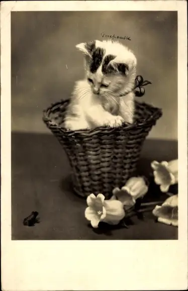 Ak Junge Katze in einem Korb beobachtet einen Frosch