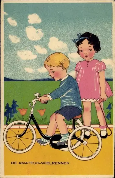 Ak Junge auf einem Dreirad, Mädchen mit Springseil
