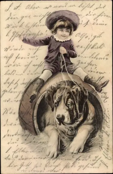 Ak Junge auf einem Fass, Bernhardiner, Hundehütte