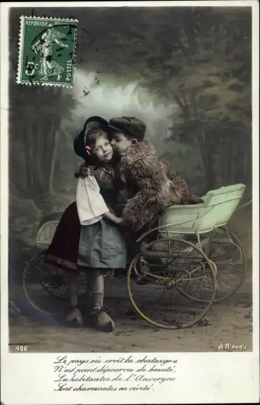 Ak Junge im Pelzmantel in einem Automobil, Mädchen, Kuss