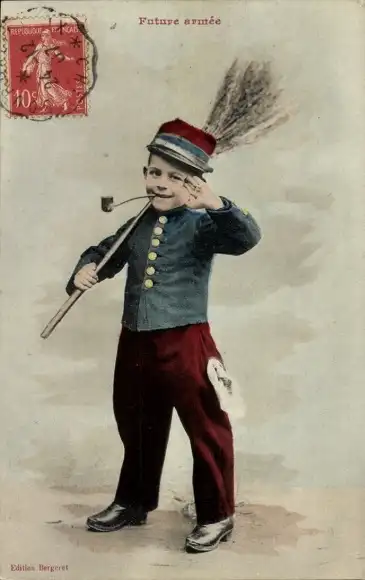 Ak Junge in Uniform, Besen, Pfeife