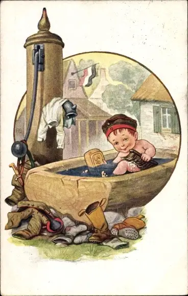 Ak Junge in Uniformmütze badet an einer Wasserpumpe