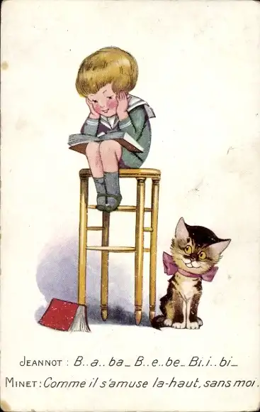 Ak Junge liest ein Buch, Hocker, Katze