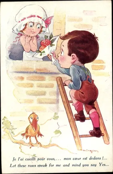 Ak Junge mit Blumen auf einer Leiter, Mädchen am Fenster
