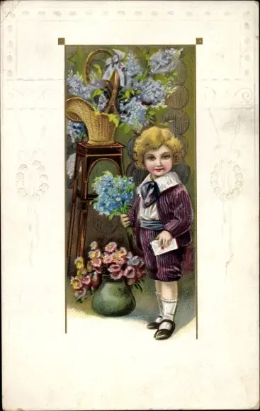 Ak Junge mit Blumenstrauß, Blumenvase, Vergissmeinnicht
