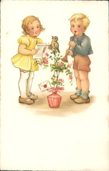 Ak Junge mit Flöte, singendes Mädchen