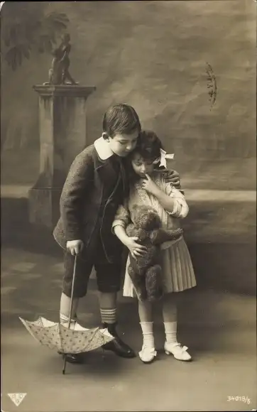 Ak Junge mit Regenschirm, Mädchen mit Teddy