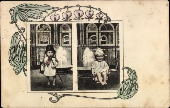 Ak Junge mit Zylinder und Gehstock, Nachttopf, Kursprudel