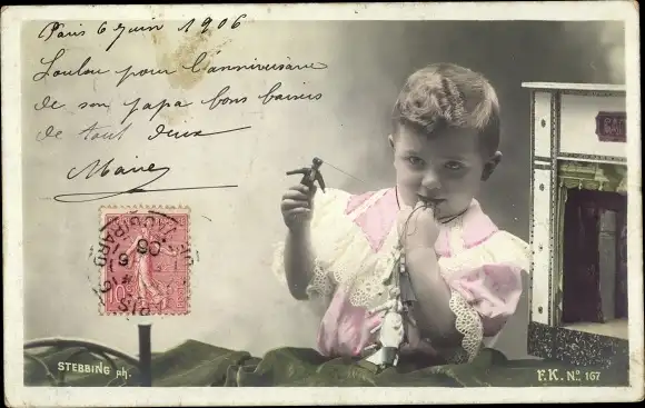 Ak Junge mit zwei kleinen Puppen