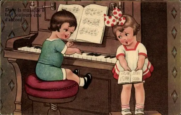 Ak Junge spielt Klavier, Singendes Mädchen, Noten