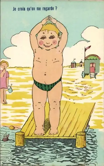 Ak Junge springt ins Wasser, Steg, Bademode, Strand