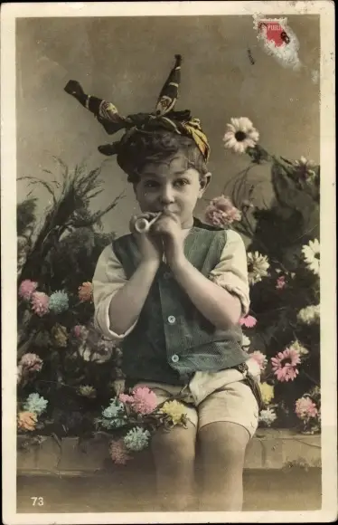 Ak Junge umgeben von Blumen raucht eine Pfeife