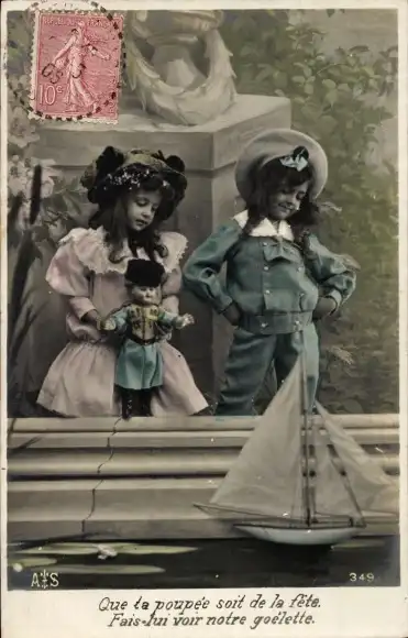 Ak Junge und Mädchen, Puppe in russischer Tracht, Modellboot