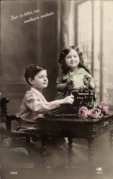 Ak Junge und Mädchen mit einer Schreibmaschine