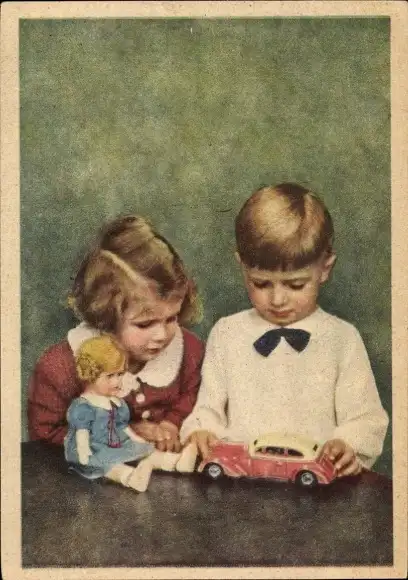 Ak Junge und Mädchen mit ihrem Spielzeug, Puppe, Modellauto