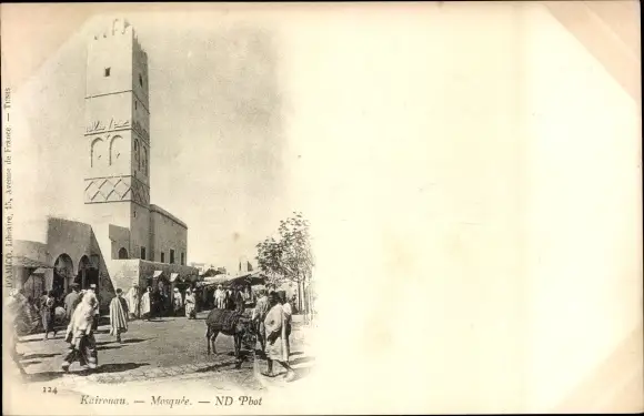 Ak Kairouan Tunesien, Blick auf die Moschee, Marktstände, Esel
