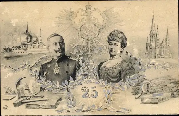 Ak Kaiser Wilhelm II., Kaiserin Auguste Viktoria, Kriegsschiff, Wappen