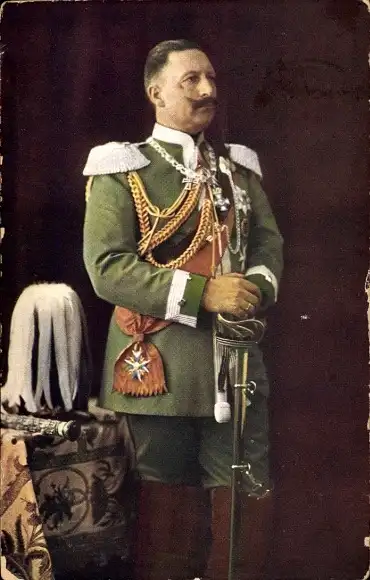 Ak Kaiser Wilhelm II., Standportrait in Uniform, Säbel, Helm, Orden