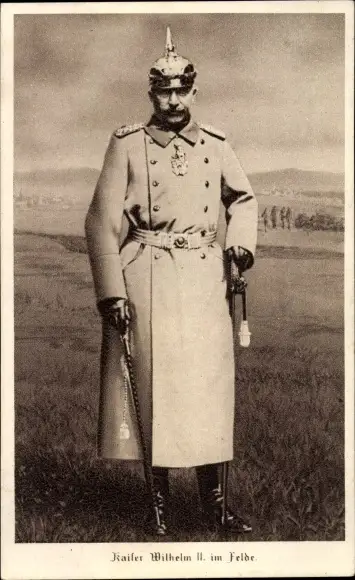 Ak Kaiser Wilhelm II. im Felde, Portrait, Mantel, Pickelhaube