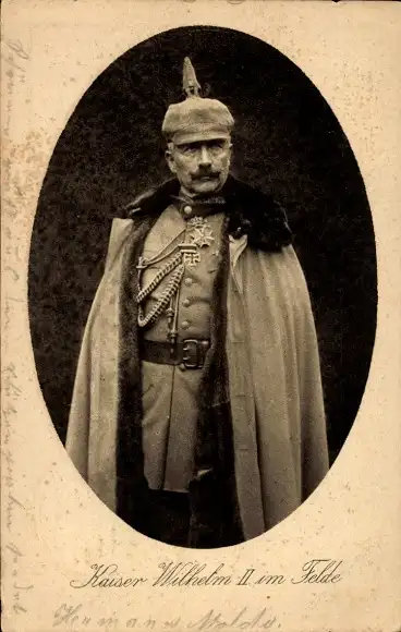 Ak Kaiser Wilhelm II. im Felde, Portrait in Uniform, Mantel, Pickelhaube