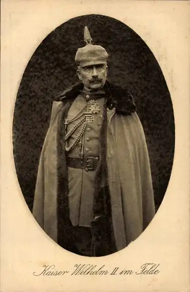 Ak Kaiser Wilhelm II. im Felde, Portrait in Uniform, Mantel, Pickelhaube