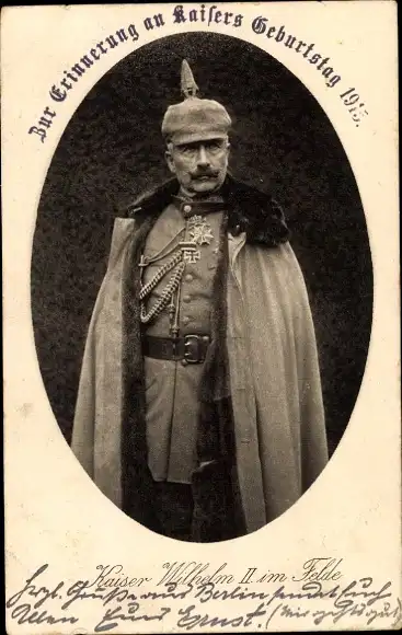 Ak Kaiser Wilhelm II. im Felde, Portrait in Uniform, Mantel, Pickelhaube, Gedicht Das Kaiserbild