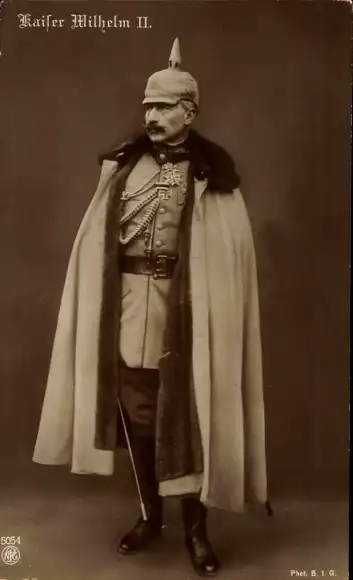 Ak Kaiser Wilhelm II. im Felde, Standportrait, Uniform, Pickelhaube, Mantel