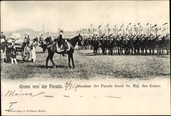 Ak Kaiser Wilhelm II. zu Pferd, Abnahme der Parade, Kavallerie-Eskadrons