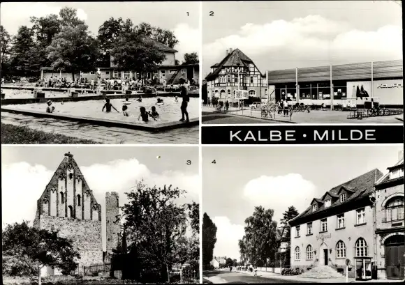 Ak Kalbe Milde in der Altmark, Freibad, HO Einkaufszentrum, Burgruine, Postamt